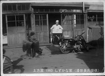 土方が東福寺付近に住んでいた当時のアパートの入口。1階は製麺所だった。写っているのは男性は大家さん(潘世美氏提供)